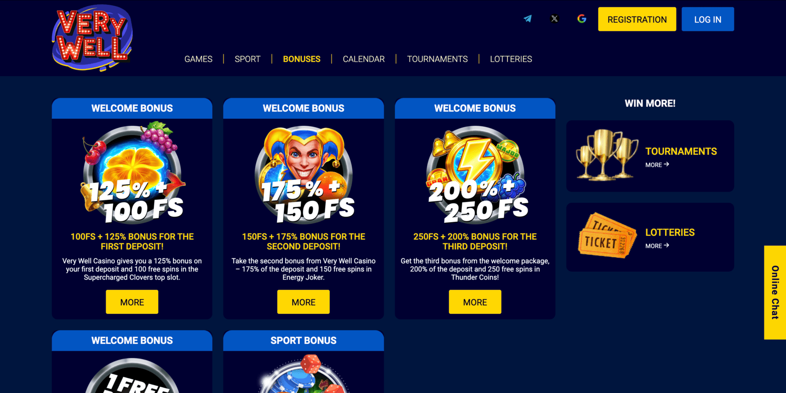 | Very Well Casino | 325 Free Spins | Gambling without submitting any documents | 4.7 |