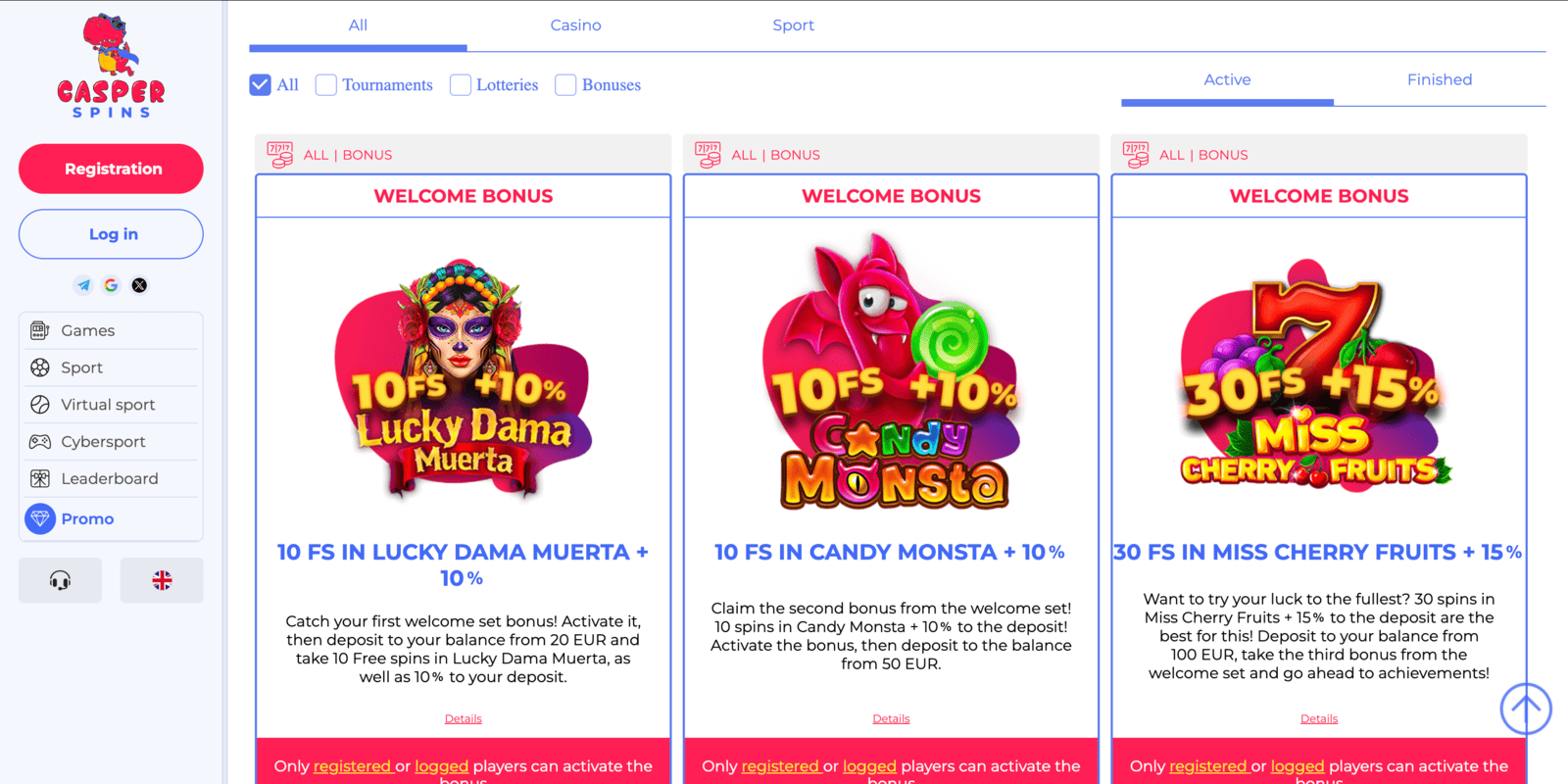 Some promos available are 10% + 10 free spins in Lucky Dama Muerta, 10% + 10 free spins in Candy Monsta, 15% + 30 free spins in Miss Cherry Fruits, and another 15% + 75 free spins in Platinum Lightning. All of these have a 1x rollover, can be activated within 72 hours after signing up, and allow you to win a maximum of €1,000.