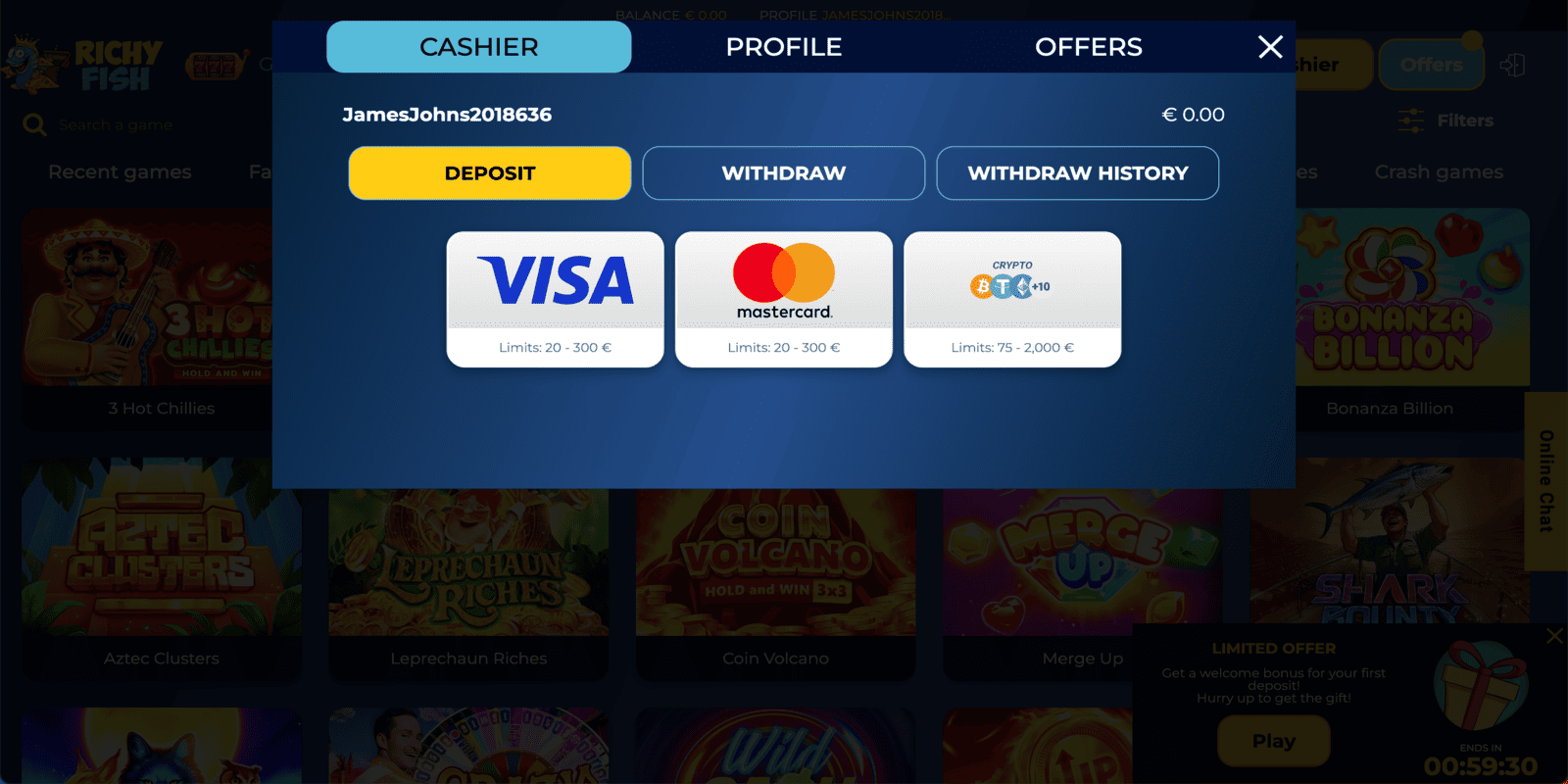 Another essential feature is that Richy Fish Casino is primarily known for its safe gaming environment, where they offer weekly slot tournaments and lotteries. Regarding payment methods, though, you should note that it does not accept PayPal or Pay By Phone, but you use cryptocurrencies, Visa, and Mastercard for seamless transactions.