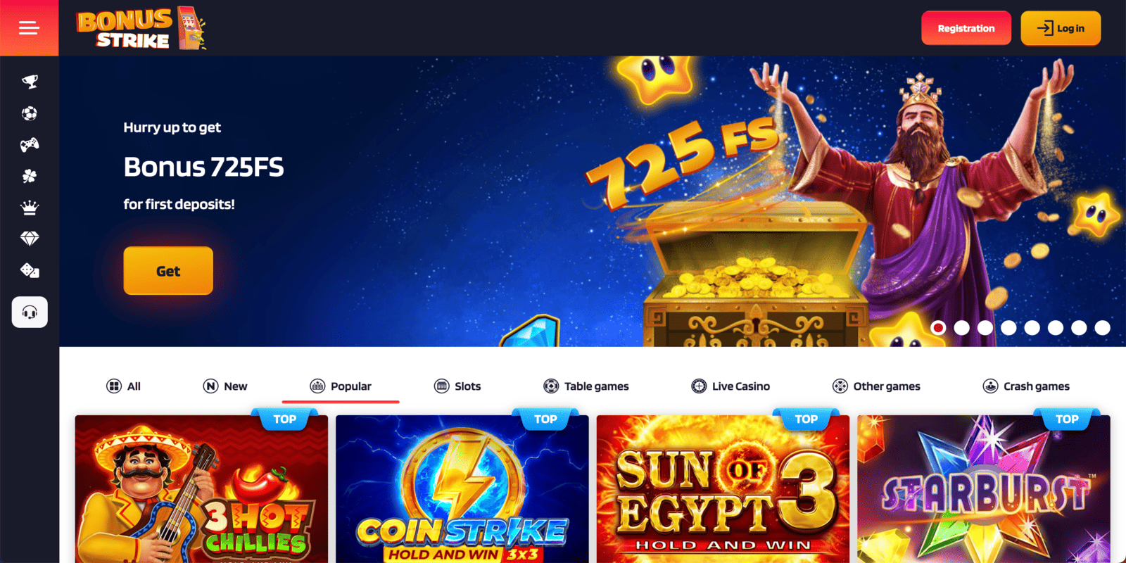 Bonus Strike Casino is one of the most popular non-GamStop websites providing NetEnt slots and table games. The platform includes a variety of deals, from sign-up offers to sports and esports bonuses, including up to 725 free spins for newbies. At Bonus Strike, you can expect a vast selection of games with amazing animations, including slots, progressive, table games, live dealers, and specialities.