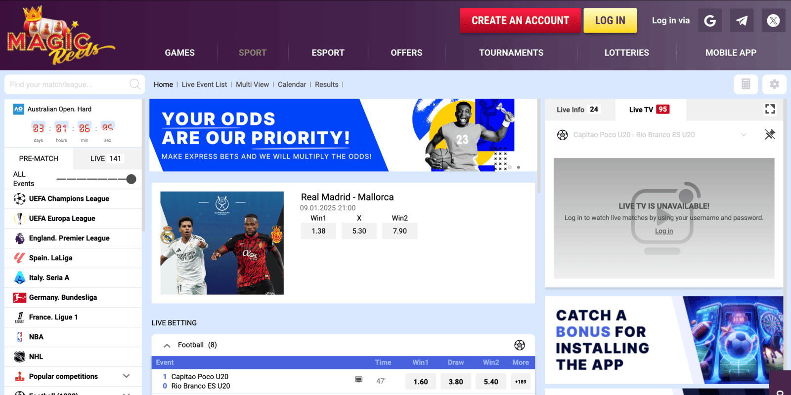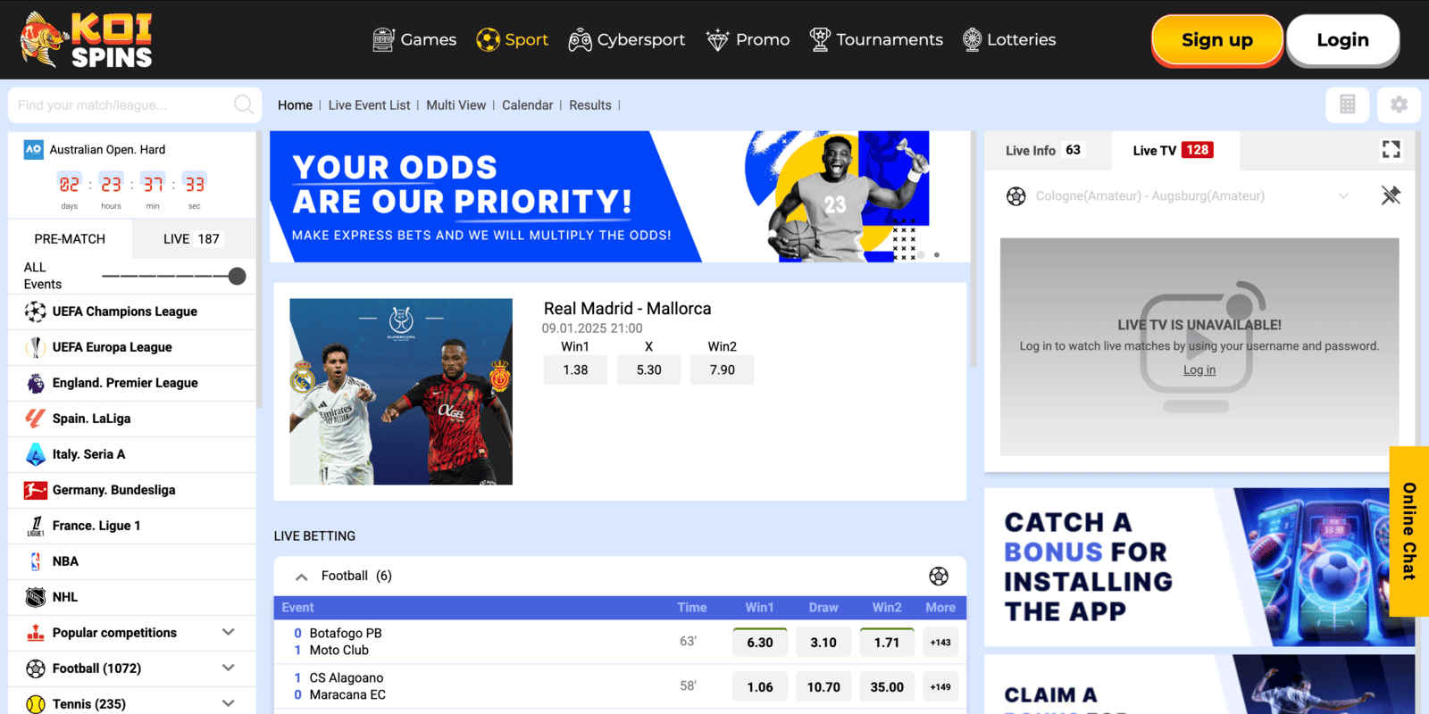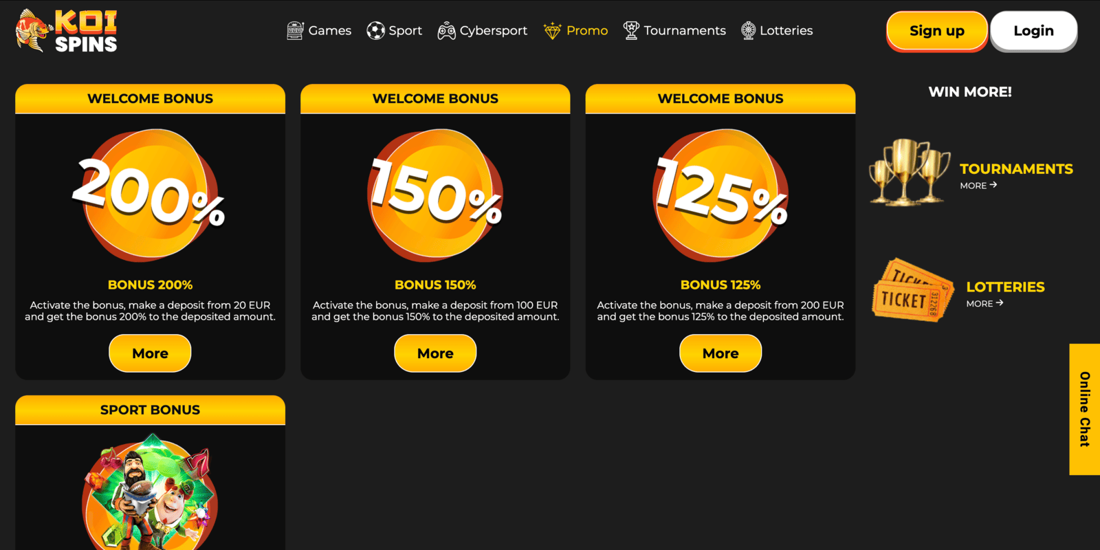 Besides slot machines and table games, you will also find some scratch cards, a live casino, and a dedicated jackpot games section. Koi Spins platform features sports betting, live betting, eSports, and virtuals, too.
