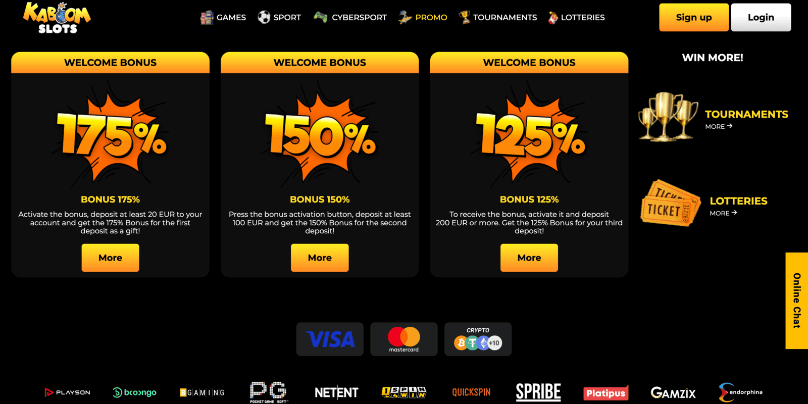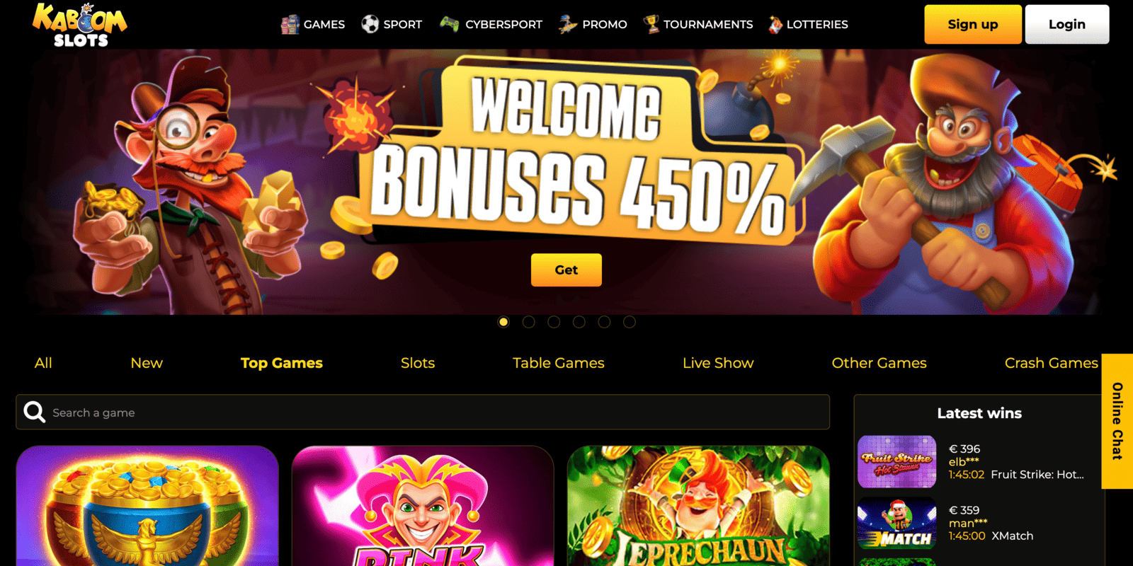 Kaboom Slots Casino is a sleek casino that is not on GamStop and supports the pay-by-phone bill method. This modern yellow and black-themed site is browser-based. It is a well-recognized brand in the igaming industry. The main tabs at the top of the home page are sports, games, tournaments, esports, lotteries, promotions and tournaments.