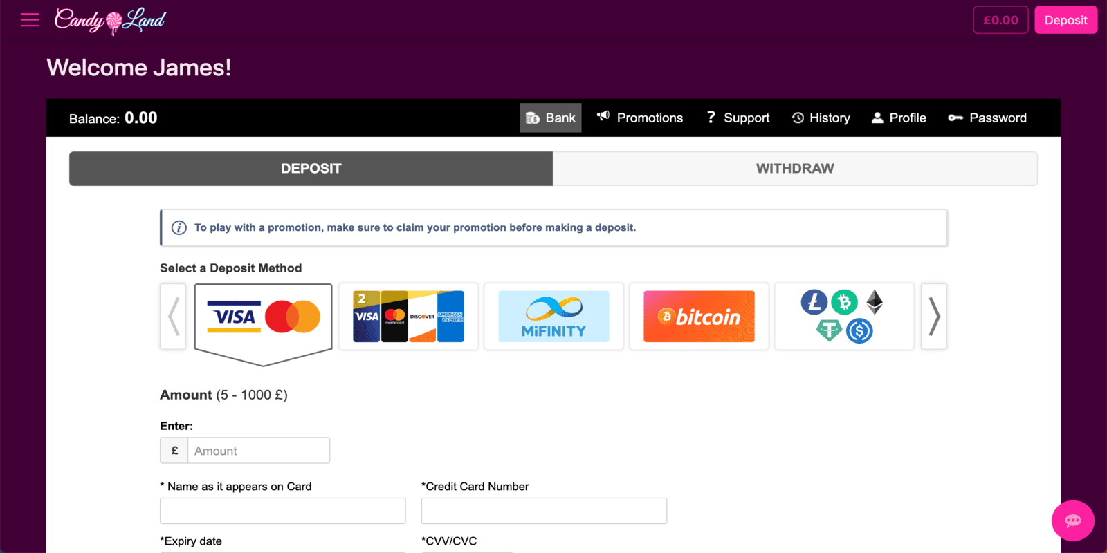 Candy Land offers plenty of payment methods. But, the variety isn’t exactly a strong suit. This platform has four credit/debit card brands, Bitcoin, and direct bank transfer. If you are looking to deposit with e-wallets like Skrill and PayPal, this platform isn’t for you.
