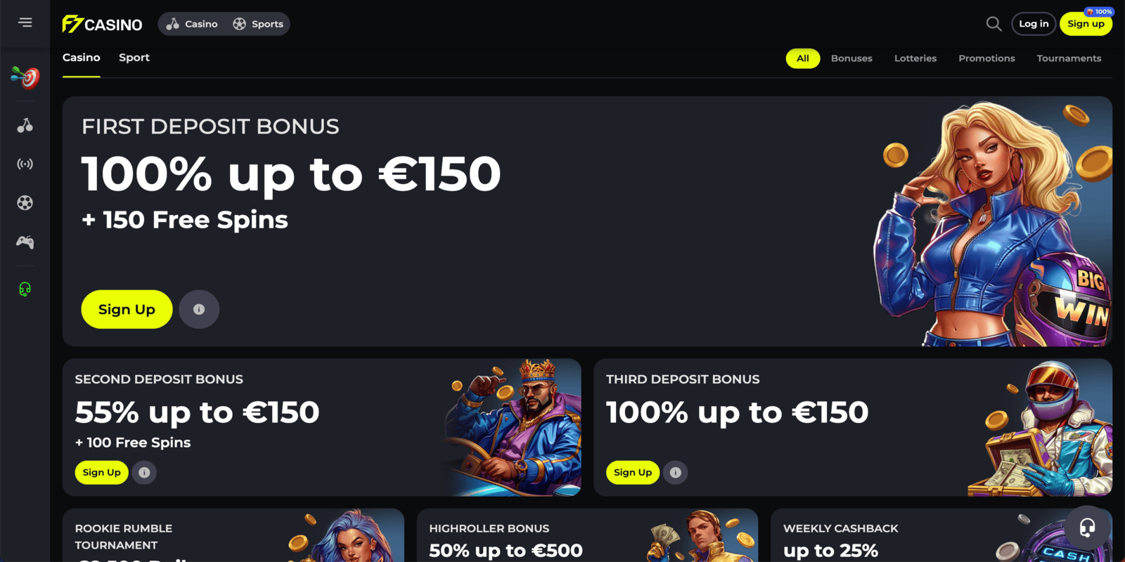 At the moment of writing this review, F7 Casino doesn’t have any no deposit bonuses for newly registered players. However, you can benefit from a large welcome bonus on the first three deposits, regardless if you came to play casino games or bet on sports.