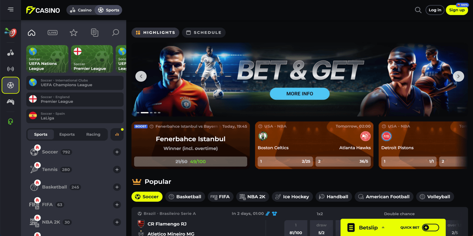 F7 Casino is a well-equipped online bookmaker not registered with GamStop, where punters can wager on numerous sports and events. You can place wagers on soccer, tennis, basketball, handball, ice hockey, and more.