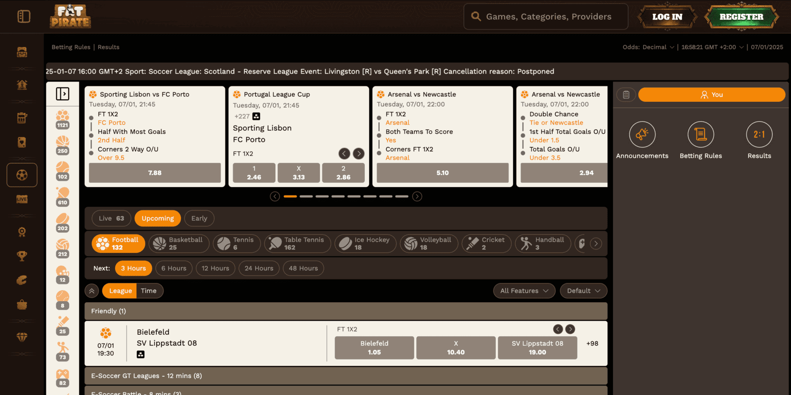 Besides being a top-rated online casino, Fat Pirate is also one of the best sportsbooks not registered with GamStop online. Sports punters can place wagers on a wide range of sports, such as football, basketball, baseball, tennis, and more. Thousands of betting events are available, and you can place bets in pre-match and live mode. Therefore, you will never have a dull moment on the platform.