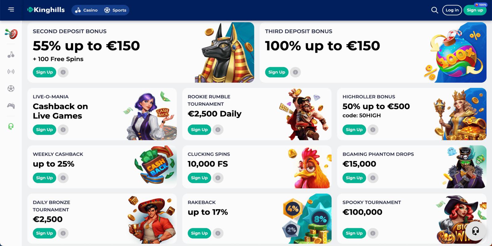 At the moment, there aren’t any Kinghills Casino no deposit bonuses available for newly registered players. However, the casino offers a generous welcome package for newbies on their first three deposits. You can take advantage of it with a minimum deposit of €15.