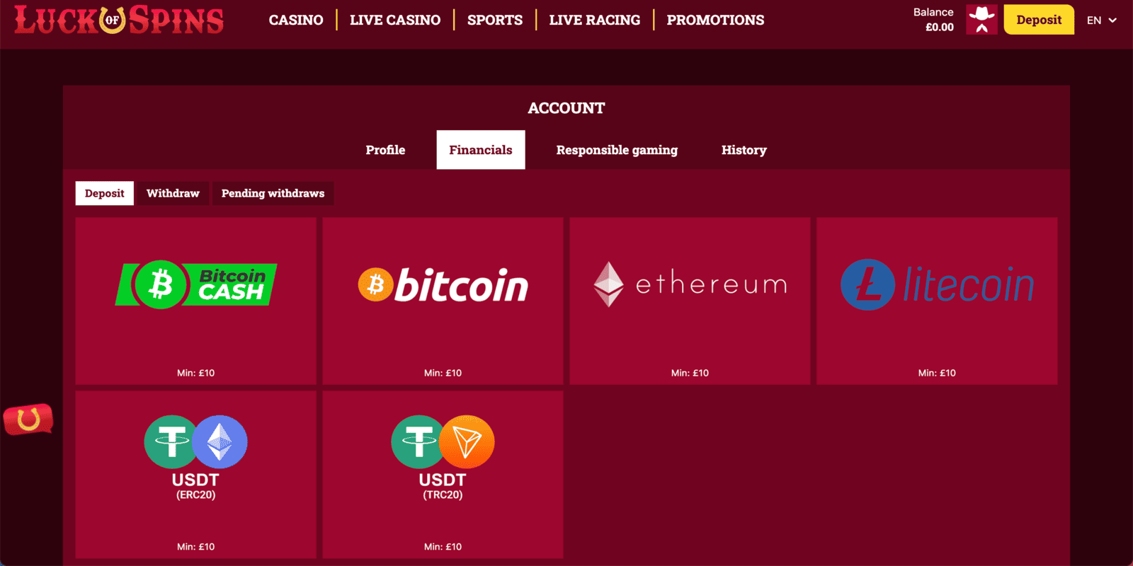 Luck of Spins accepts a wide range of fiat and cryptocurrency payments. This crypto-friendly site provides extra benefits for using digital coins. Accepted options include Litecoin, Bitcoin, Ethereum and Bitcoin Cash. This non-GamStop operator supports added banking methods like debit and credit cards, e-wallets and bank transfers. To upload cash on the site, the user will go to the My Account section and click on Deposit. They will see all the available options. Withdrawals take 2 business days to be reviewed and processed. In some instances, it might take longer. This is subject to the specific disbursement method used. All account transactions are processed in EUR/USD/GBP.