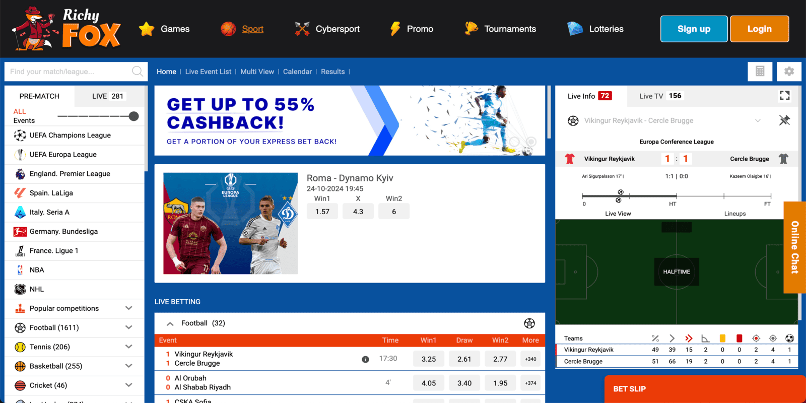 Richy Fox is a top solution for those who are looking for a no verification bookie. Thanks to the inbuilt sportsbook, you can select among thousands of events that are constantly updating. Here you can try your luck predicting outcomes of local and world events within regular as well as eSports disciplines. The event grid is intuitively understandable, so the whole process (from picking a match to submitting a bet slip) does not take more than a minute.