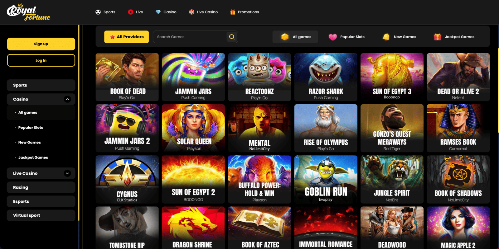 The slots collection at Royal Fortune Casino is extensive and covers a wide range of slot titles for players. Moreover, these slot titles are from top software providers such as Playson, NoLimitCity, ELK Studios, Spinomenal, Vibra Gaming, Thunderkick, Yggdrasil, and Blueprint Gaming. Popular titles include Book of Anubis, Deadwood, Mental, Book of Shadows, and African Rampage.