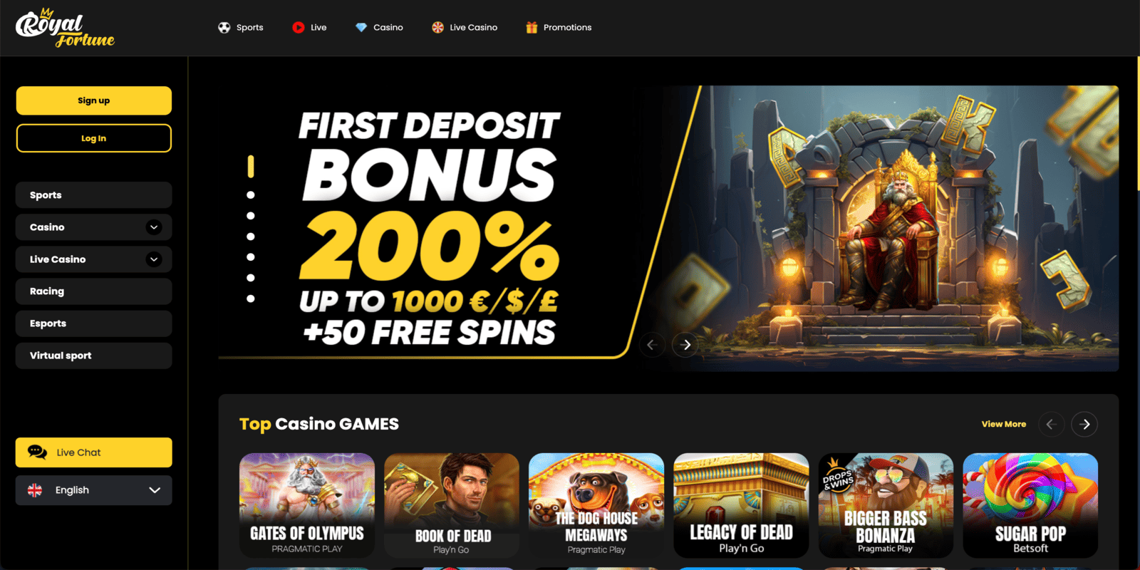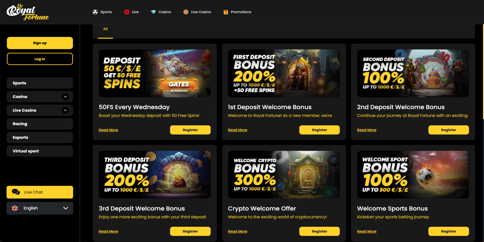 The game portfolio at Royal Fortune Casino is extensive and includes an active sportsbook, virtual sports, live casino, and casino games. Players can test their gaming skills on a different range of gaming options available. Here is a breakdown of popular gaming options available: