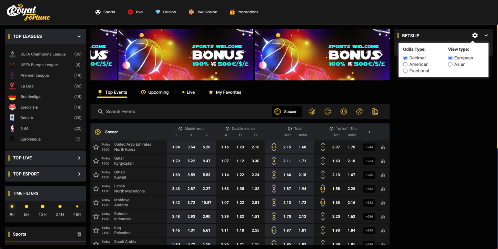 Royal Fortune Casino has an extensive portfolio of sports betting options for players to explore. Various markets are available, including soccer, baseball, volleyball, ice hockey, rugby, American Football, Formula 1, handball, and volleyball. Also, there is an extensive range of bets, from moneyline bets, in-play or live betting, future bets, parlay bets, proposition bets, or point-spread bets.
