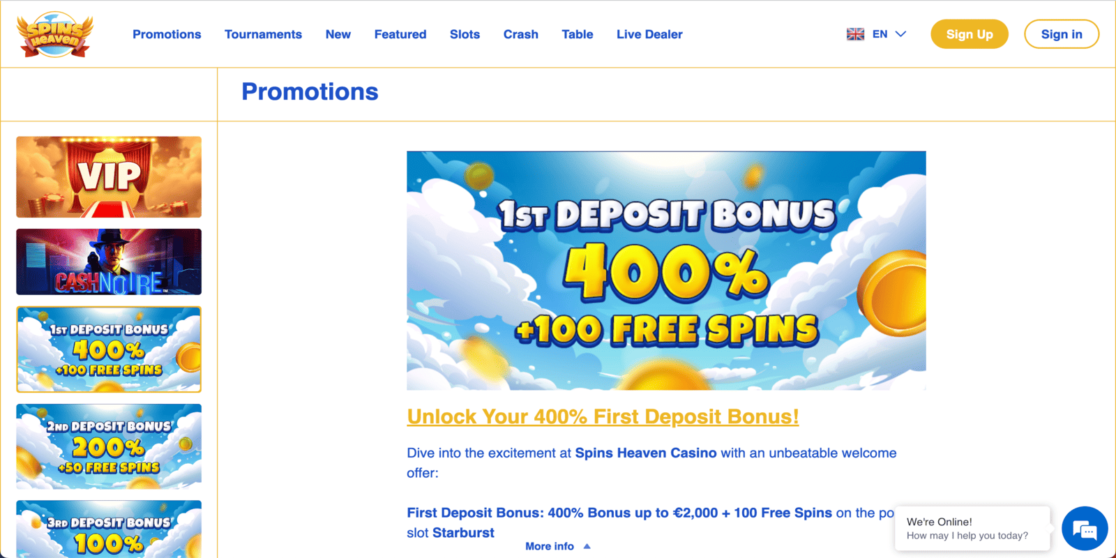Bonus deals are one of Spins Heaven’s strengths. As a new member, you are entitled to a multi-tier welcome bonus. Additional offers are provided for existing members.