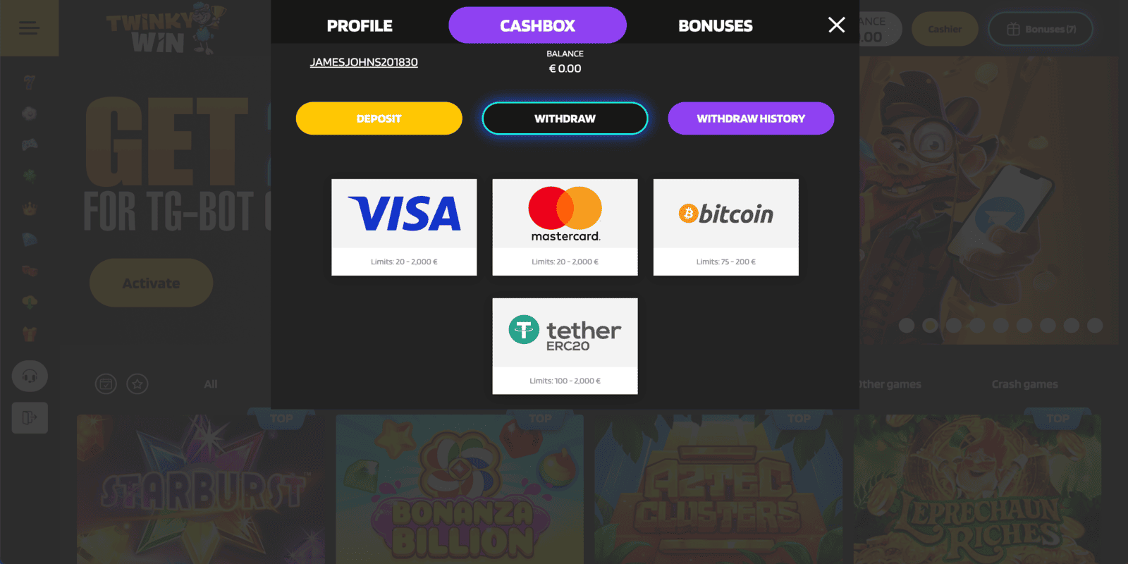 Twinky Win provides a lot of payment methods you can 100% trust. All of them are secured, reliable and are constantly checked by independent auditors. Another advantage of Twinky Win banking options is that they accept payments in fiat money as well as cryptocurrency (for example, Bitcoin, Tether, and Binance Pay). Scroll down and do everything you need about the payment methods at Twinky Win casino.