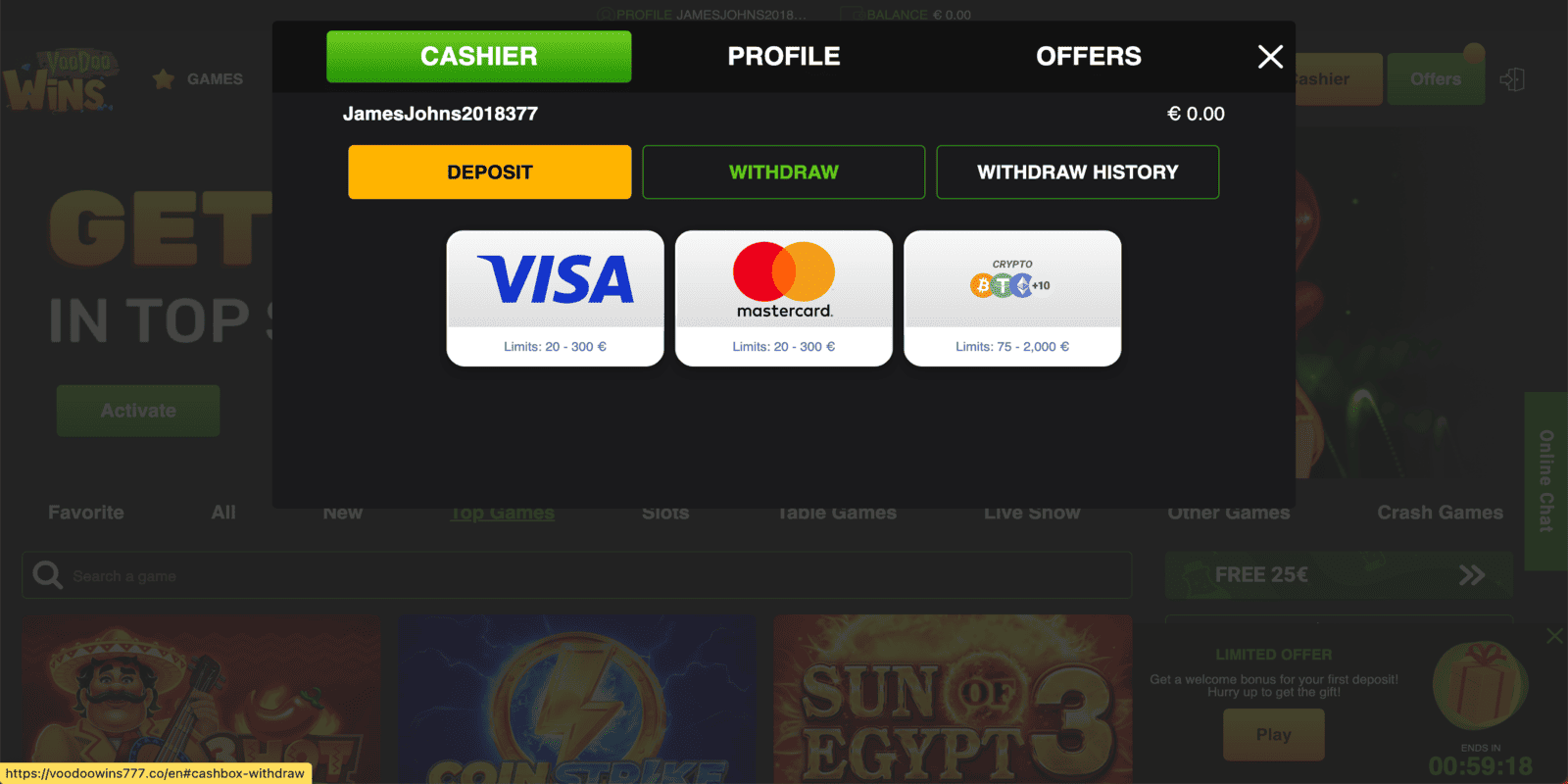 Voodoo Wins Casino does not offer players a massive range of banking options. For deposits, you can use either credit cards like Visa and MasterCard or cryptos like Bitcoin and Tether. Regardless of your chosen method, the maximum amount you can top up your account at once is €2,000.